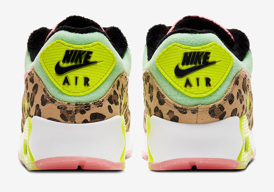 The first pair comes dressed in Illusion Green, Sunset Pulse, Black and White. Using leopard print across the mudguards while washed denim lands on the panels. In addition we have Pink translucent Swoosh logos, tumbled leather applied to the toe cap, a fury Black liner along with Neon Green on the ankle. The second features White, Illusion Green, Laser Fuchsia and Black. Highlighted with iridescent on the overlays while leopard print is applied to the liner. Finishing the two is a daisy logo on the tongue and insoles.