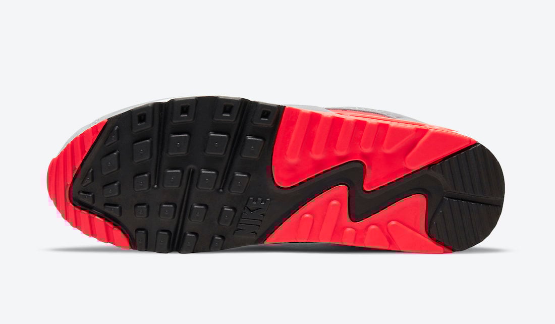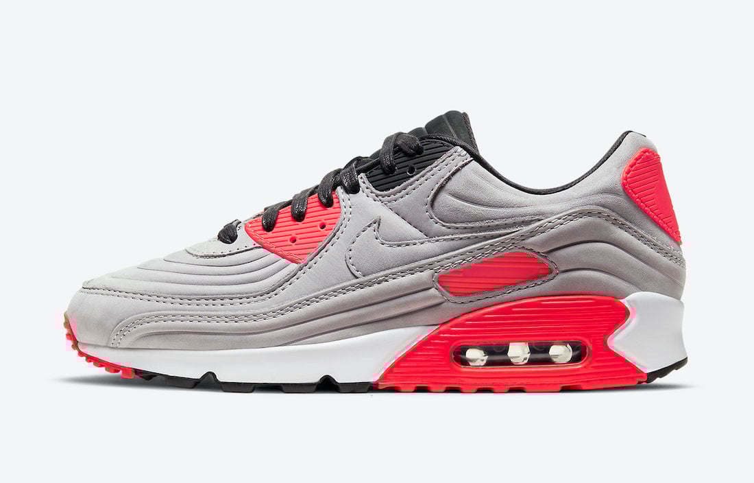 Looking closer, this Nike Air Max 90 features a Night Silver and Bright Crimson color combination. Grey suede lands on the upper while added molded ridges cover the toe and mudguard. Following, Black hits the tongue, laces, and liner. Furthermore, the real highlight is Bright Crimson. The shade lands on the bottom eyelet, around the Air Max unit, branding on the side, and other small details. Lastly, a White midsole and mostly Black on the outsole finish the look.