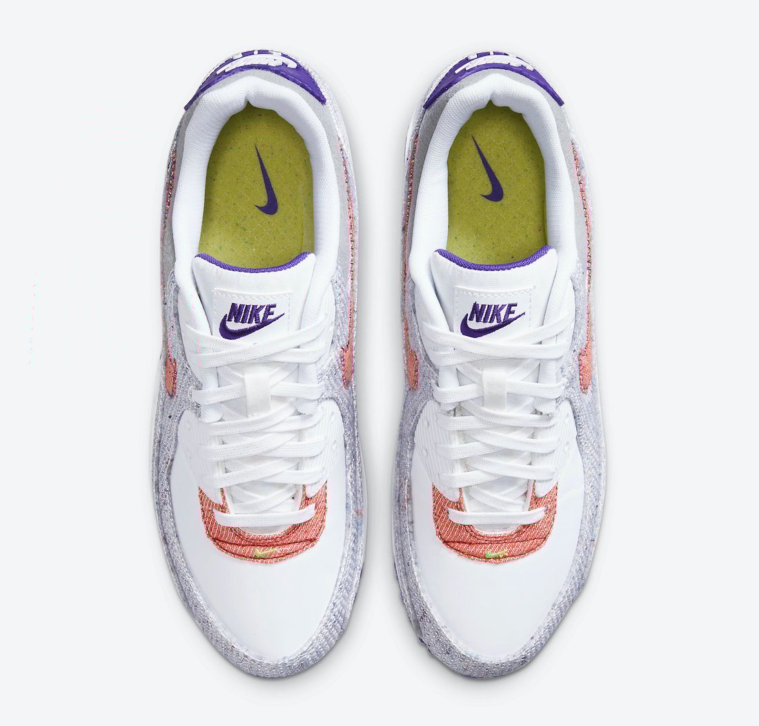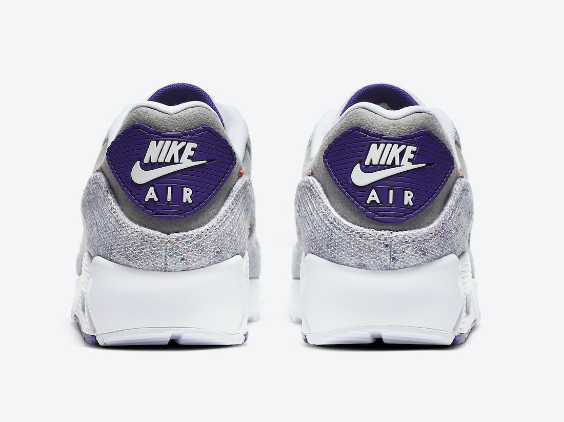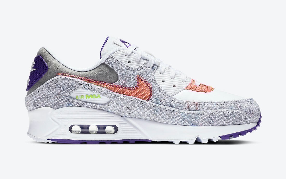Looking closer, this Nike Air Max 90 comes dressed in a White, Electric Green, and Court Purple color combination. Highlighted with White on the eyelets, tongue, laces, toe, and midsole while Grey is applied to the ankle. Constructed with recycled yarn on the mudguard, wrapping the toe and upper while Red hits the Swoosh on the lower part of the eyestay. Other details include White and Purple on the outsole and recycled insoles.