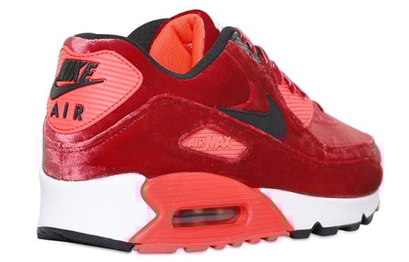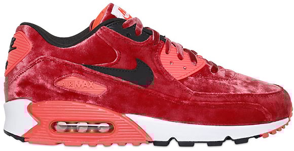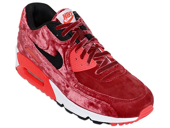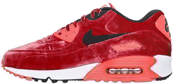 Apart of the celebration series from Nike, the Red Velvet Air Max 90 uses exactly that, red velvet on the uppers. Infrared is used on the inside of the tongue and heel while the branding is in black to stand out.