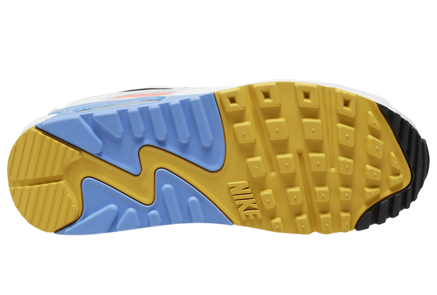 Specifically this Nike Air Max 90 comes dressed in a Pure Platinum and Solar Flare color combination. Using White mesh on the base while Platinum leather is applied to the overlays and mudguard. In addition we have Black used on the Swoosh, tongue and heel branding. Completing the look is Peach, Yellow and Blue accents.