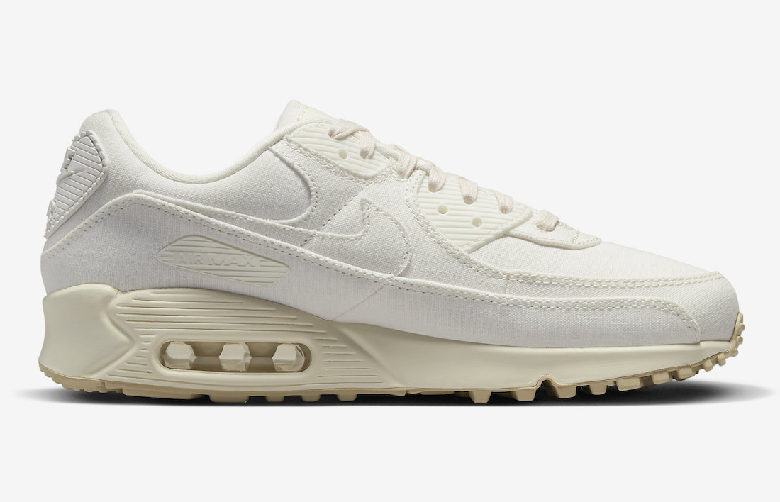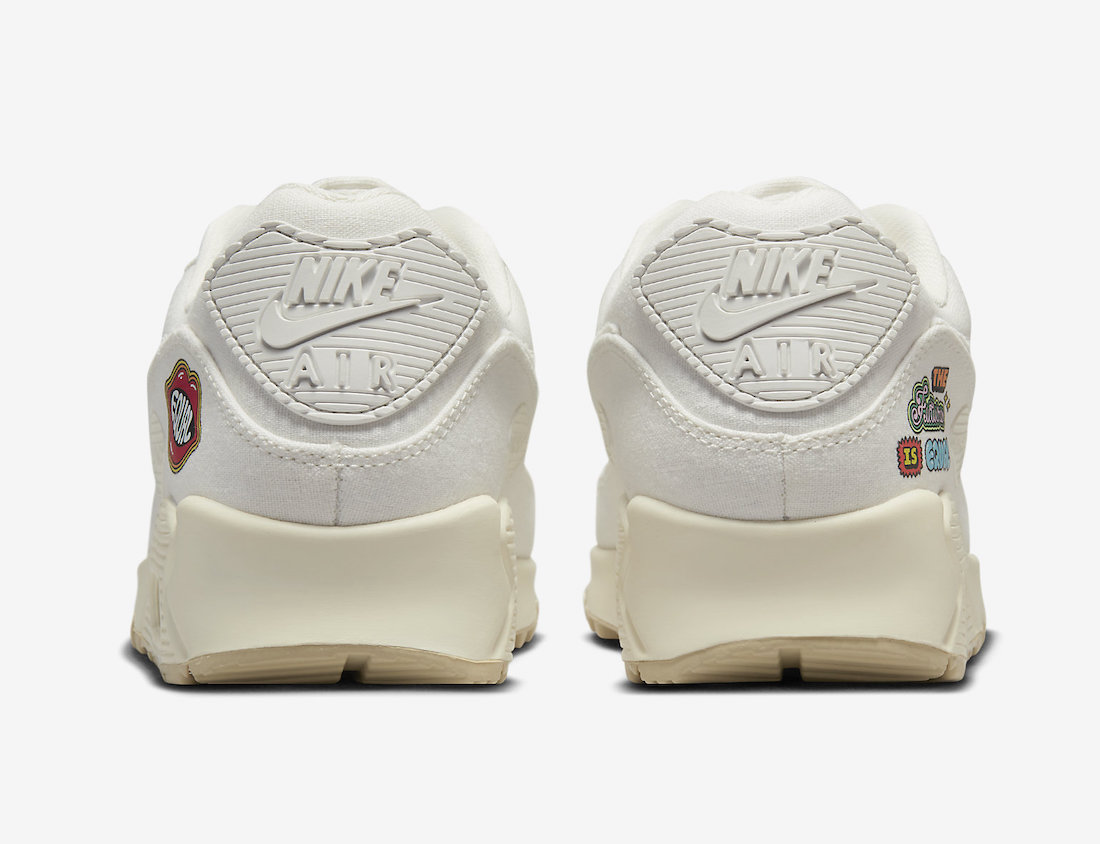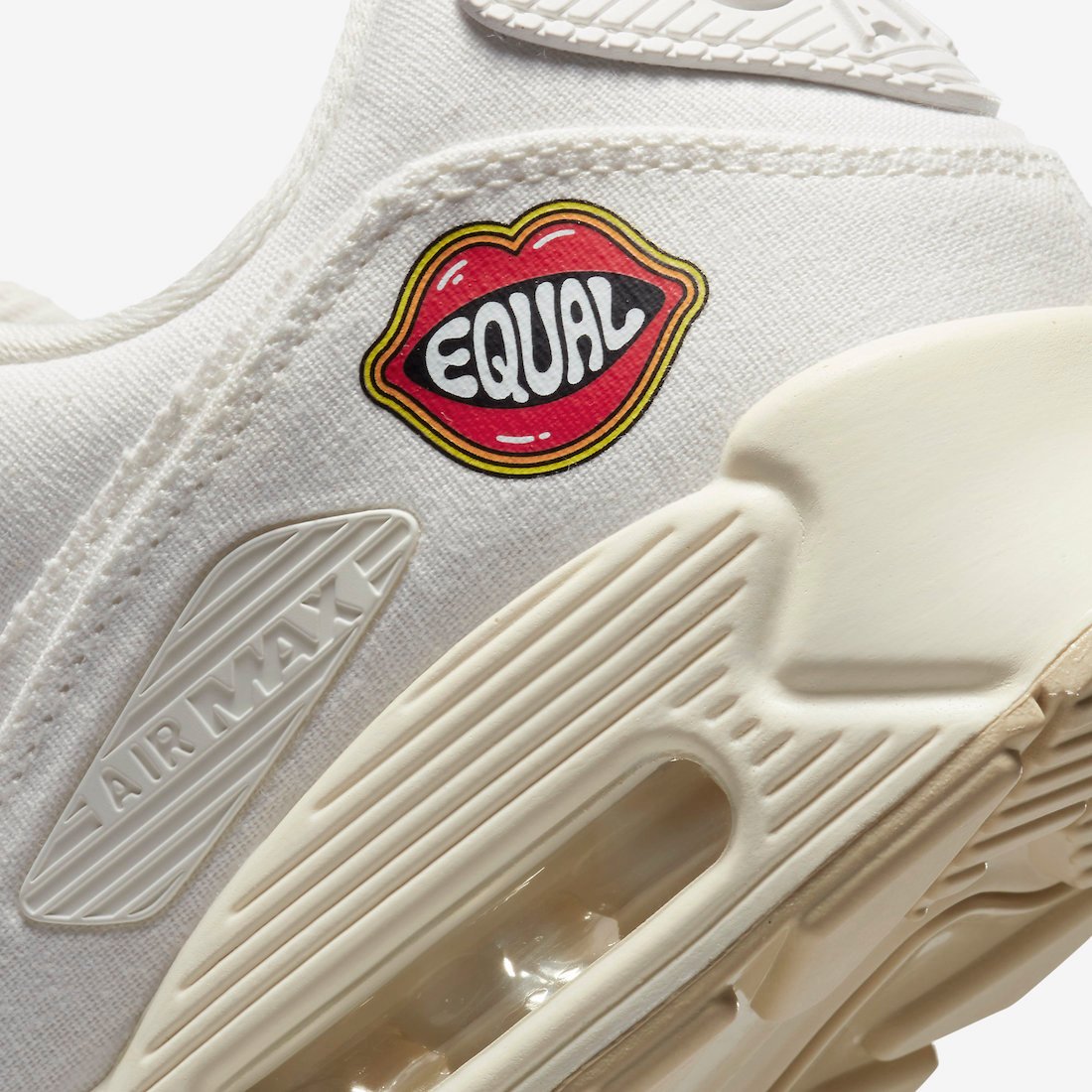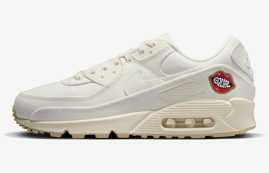 This Nike Air Max 90 features the same color scheme, consisting of a Sail, Cashmere, Team Gold, Black, and White color combination. Constructed with canvas on the upper, and we have tonal branding. Next, we have lips with the word โEqualโ on the lateral ankle and special messages on the insoles. Finishing the look is a two-tone rubber sole.