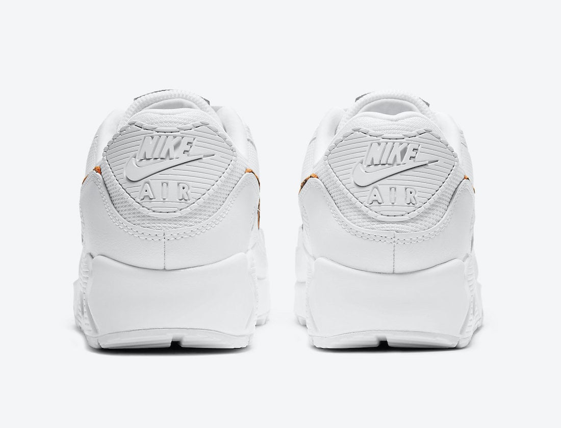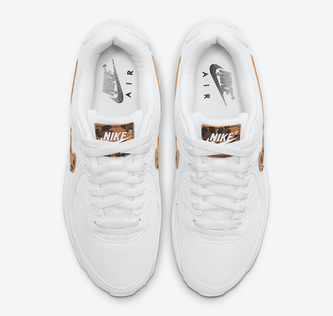 Looking closer, this Nike Air Max 90 features White across the uppers while constructed with mesh on the base and smooth leather on the overlays. Following, we have leopard print running across the Swoosh and tongue label, which gives this simple look some spice. Lastly, Black appears on the insole branding, the Nike Air on the heel features White, while more White adorns the midsole and rubber outsole to finish the look.
