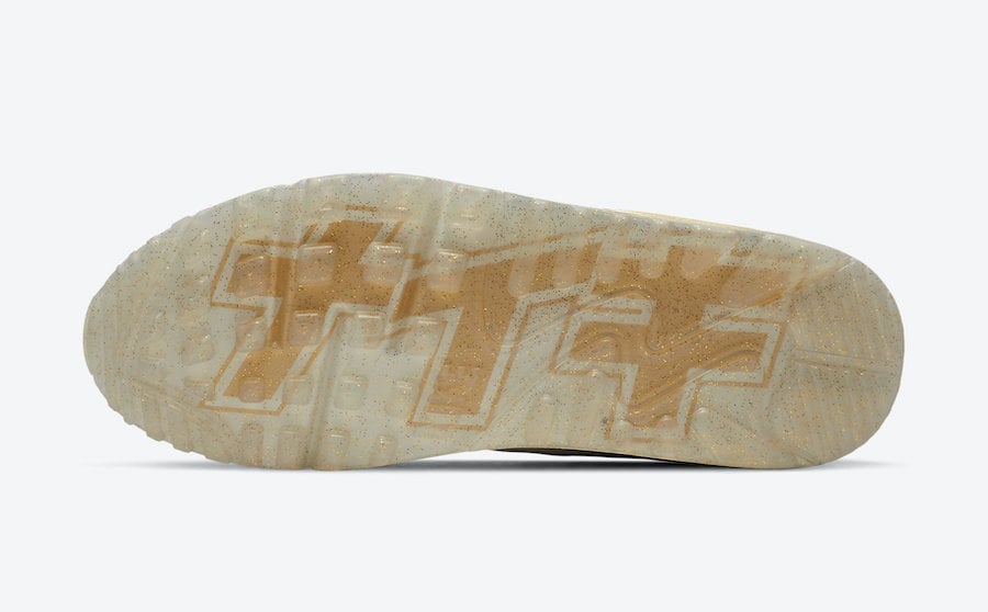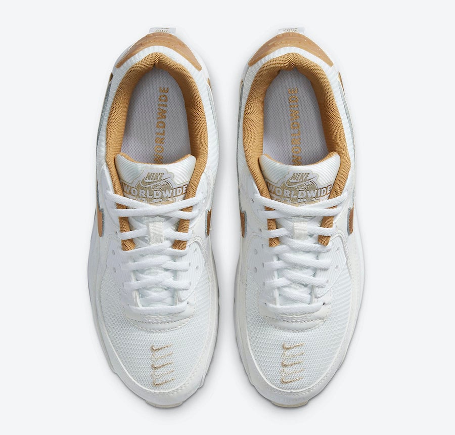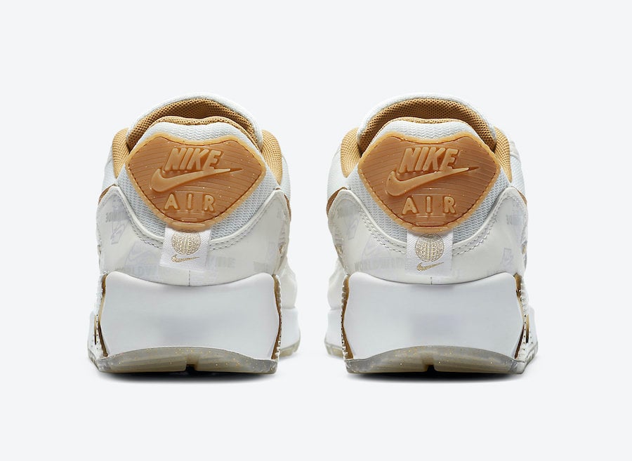 Looking closer this Nike Air Max 90 comes with White mesh across the upper along with White overlays with subtle print. Giving this pair a luxurious look is the use Gold accents. Following we have stacked Swoosh logos on the toe, โWorldwideโ branding on the tongue and insoles, globe tag on the heel while Gold covers the rubber outsole with a glitter finish.