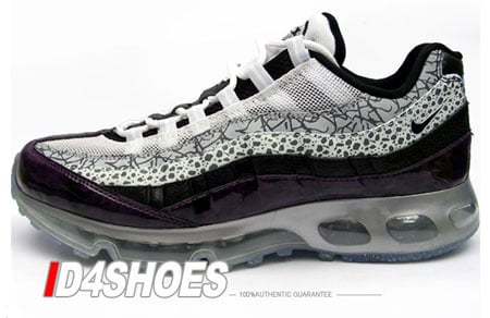 This Air Max 95 360 Hybrid features a mixture of different patterns, designs and material at each panel. An elephant-like print, safari print, and Purple patent leather make up the upper along with pebbled leather an icy sole with Silver speckles. Unfortunately these have not been released in the U.S yet, but it is available for purchase on the eBay.