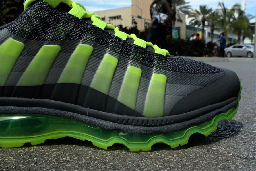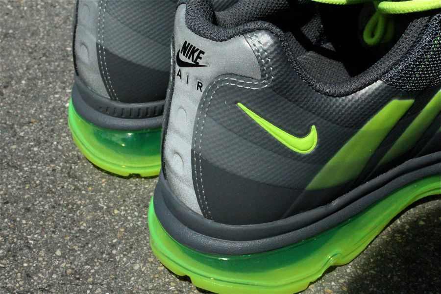 A silhouette that first debuted here in the US as a part of Nike Sportswear’s “What The Max” Collection, the kicks pair a Hyperfuse version of the Air Max 95 upper with a 360 Max Air unit and, in this case, see a predominately grey and anthracite look with Volt accents throughout.