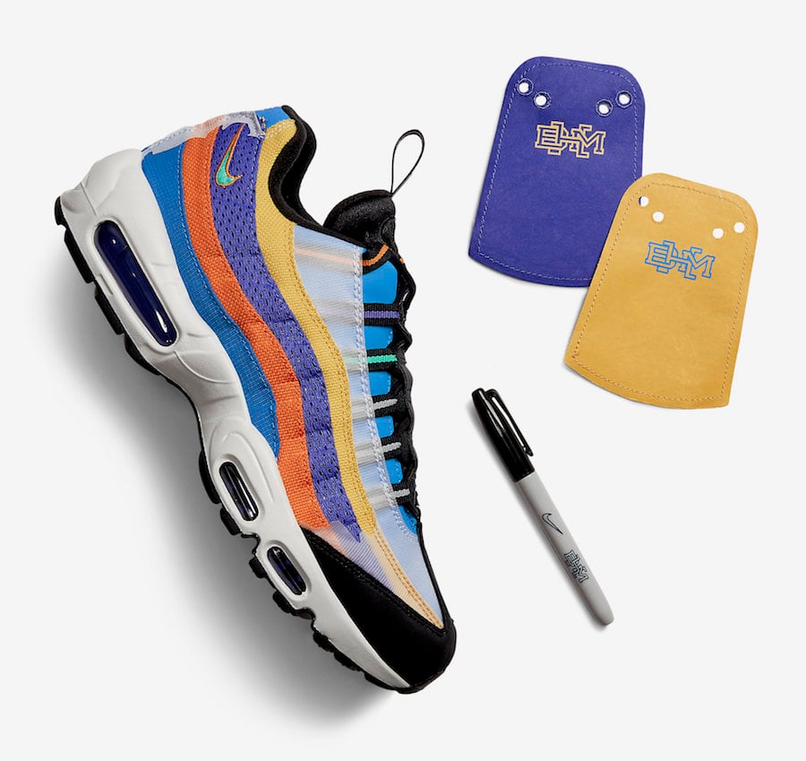 This Nike Air Max 95 comes dressed in a Multi-Color, Kinetic Green and Photon Dust color combination. Featuring translucent plastic on the overlays which will tear-away. In addition we have canvas, ripstop and jersey mesh across the overlays. In addition we have โBHMโ branding on the tongue and insoles along with a mismatched customizable shroud on the overlays along with a co-branded sharpie.