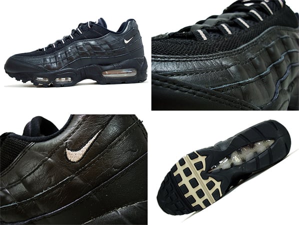 Nike is no stranger to using ostrich leather on their sneakers and have perfected it quite well as seen on numerous models over the few years. Aside from ostrich leather, this Air Max 95 is dressed in a black upper with light taupe accents on the swoosh, lacing area and on the sole. This Air Max 95 was thought to the be a JD Sports exclusive a few weeks back, but it has popped up on a few online retailers including Bingo Runner.ย
