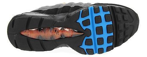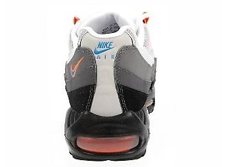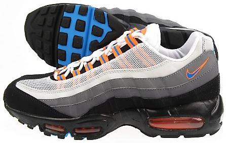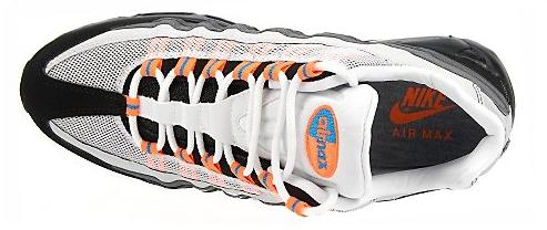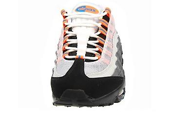 After showing you the sample “Air Penny” Nike Air Max 95 that will most likely take a lot of connections and pleading to score as part of your collection, we now bring you another Nike Air Max 95 treat slightly more attainable. Pictured here is a pair of the iconic Nike Air Max 95 sure to at least catch the eyes of certain sports fans such as New York Knicks and Mets enthusiasts for its colorway. Besides a black sole and mudguard, the upper also contains two “waves” of grey. Above those waves are white ones to finish off the upper, but orange and blue accents are seen throughout- such as on the Nike swoosh, tongue, and shoelace holes. To finish it all off, the air bubble units come in transluscent orange. Click on the jump for more pictures of this Nike Air Max 95 colorway and a source through which those of you who fall in love with this sneaker can purchase it now.