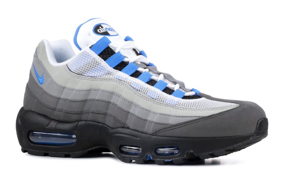This Nike Air Max 95 features a Grey gradient across the panels while White lands on the mesh. In addition we have Crystal Blue on the tongue, liner, Nike Swoosh logos, eyelets, Air Max unit and outsole. Completing the look is Black across the midsole and outsole.