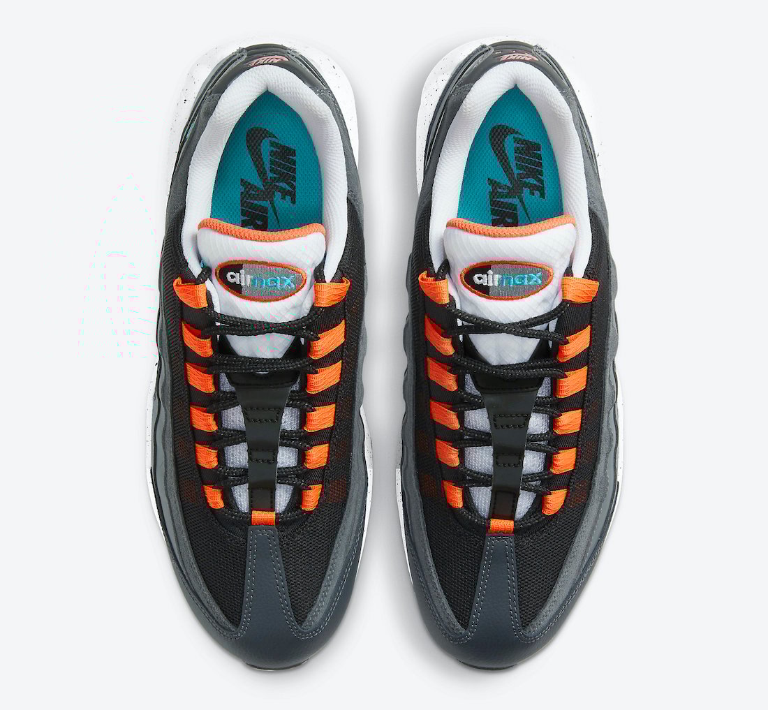 Looking closer, this Nike Air Max 95 features a mesh, leather, and suede construction while shades of Grey run throughout. Next, we have Orange and Teal Blue accents while 3M reflective lands on the heel. Finally, a speckled midsole and a Black rubber outsole complete the look.