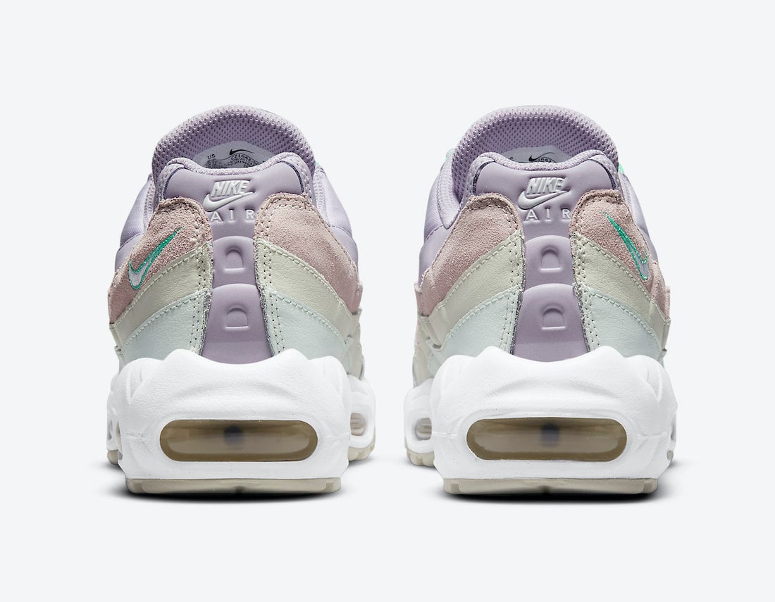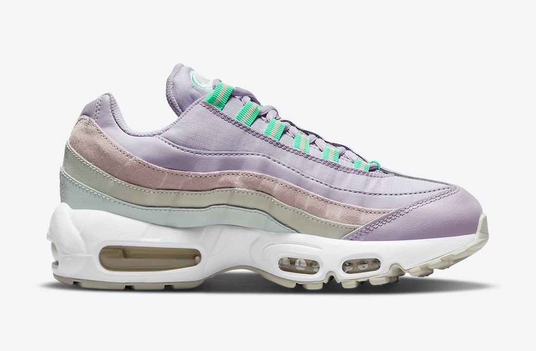 Looking closer, this Nike Air Max 95 comes constructed with ripstop, mesh, leather, and suede while Light Violet appears around the toe, down the panels, tongue, and laces. Next, neutral shades of Pink, Bone, and Beige appear on the lower panels with Green on the eyelets, outlining the Swoosh by the heel, and tongue branding. Lastly, a White midsole and a Beige rubber outsole finish the look.