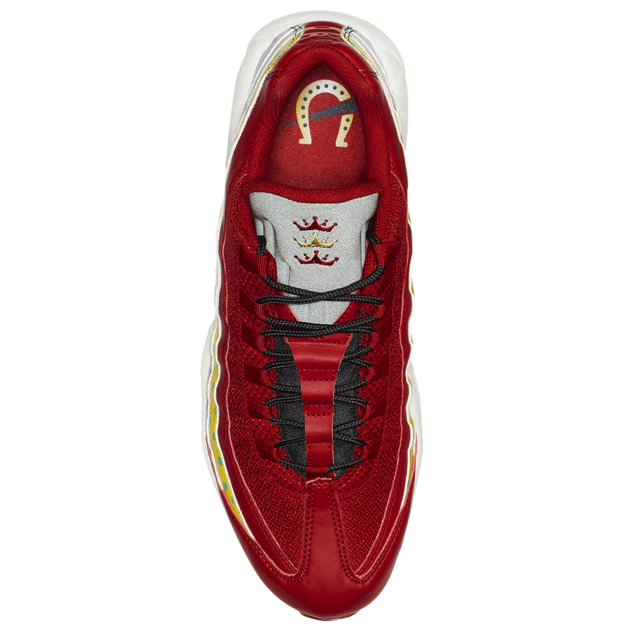 This Nike Air Max 95 comes dressed in a Gym Red, Black and White color combination. Looking closer it features three crown logos on the reflective tongue in Red and Gold while a horse shoe lands on the insoles. On the side panels we have different designs consisting of stripes, squares and polka dots. Other details includes Gym Red across the upper while constructed with leather and suede, White across the midsole and more Red across the outsole.