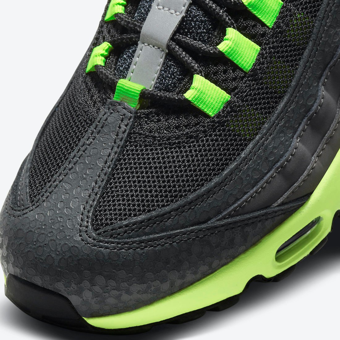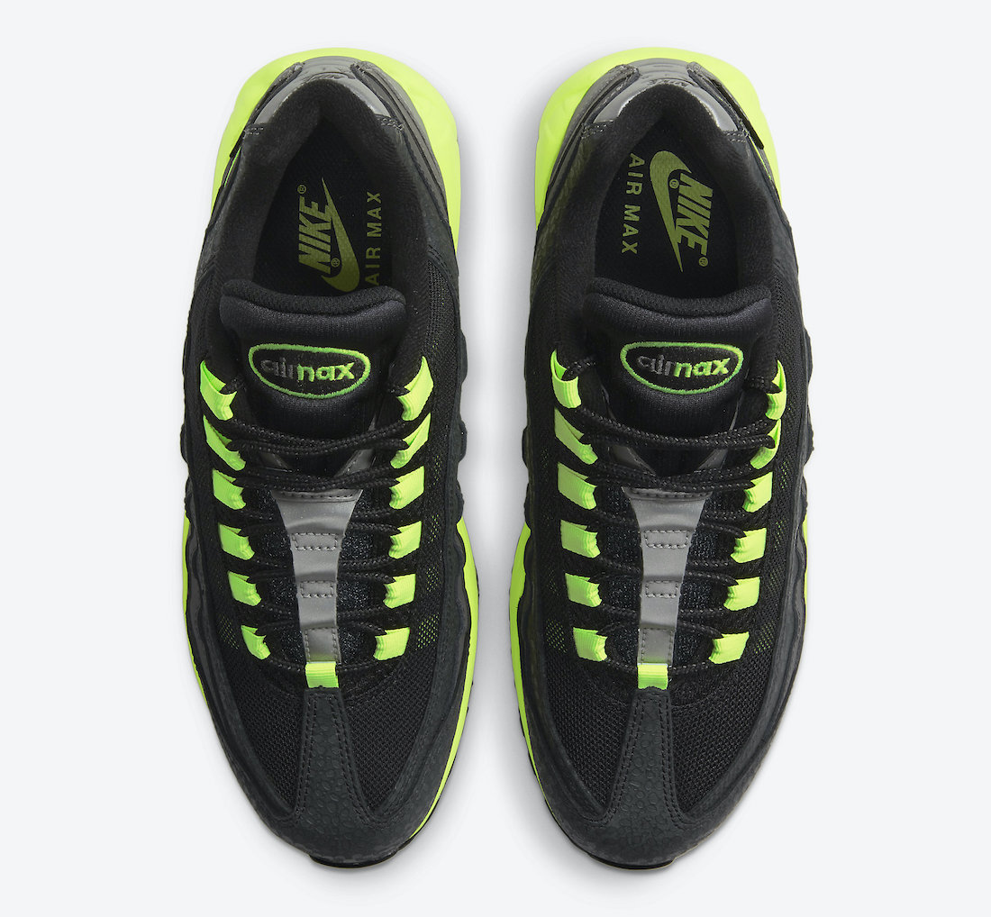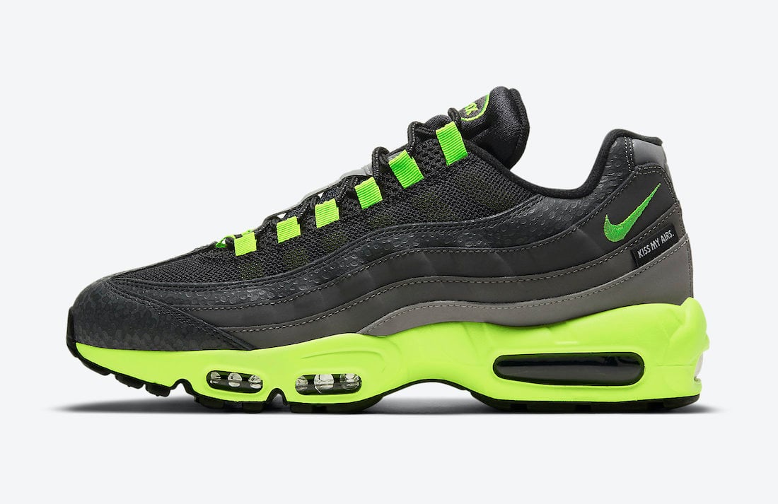 This Nike Air Max 95 comes dressed in a Black and Volt color combination. First, the pair features Black on the upper while a subtle safari print runs throughout. Next, we have โKiss My Airsโ on the lateral side while 3M reflective adorns the tongue and heel. Finally, a Volt midsole and a Black rubber outsole finish the look.