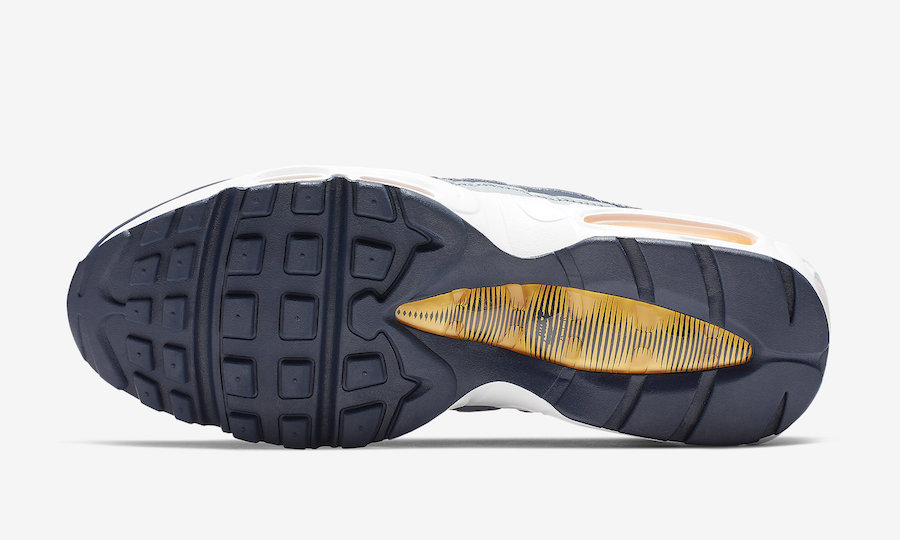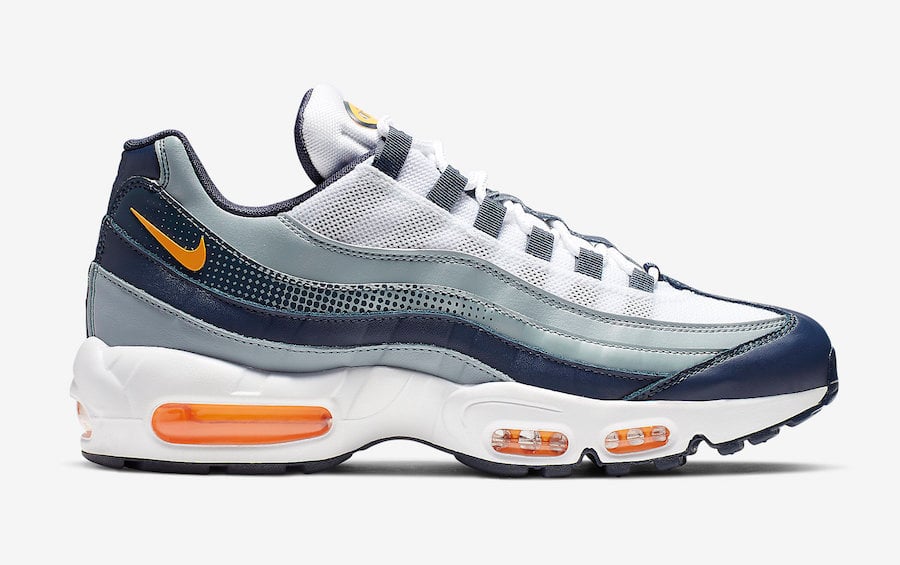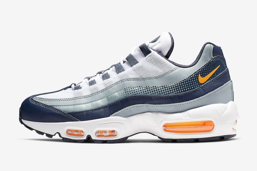 This Nike Air Max 95 comes dressed in a Midnight Navy, Laser Orange and White color combination. Utilizing a White mesh upper along with Grey and Navy Blue applied to the leather on the toe and lower part of the panels. In addition a gradient dot pattern is used while Laser Orange is applied to the tongue branding, Swoosh and within the Air Max unit. Finishing the look is a White midsole and Black rubber outsole.