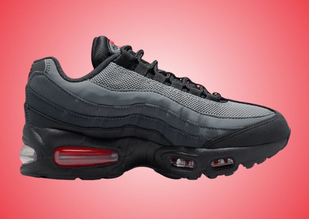 This Nike Air Max 95 is dressed in a Black, Bright Crimson, Anthracite, Iron Grey, Smoke Grey, and Light Smoke Grey color scheme. As you can see, the shoes feature a gradient upper, like most AM 95s. Dressed in darker shades throughout, what stands out is the Bright Crimson detailing on the tongue branding, Swoosh, Nike Air, and within the Air Max unit. Other details include 3M reflective accents with Black on the midsole and rubber outsole.