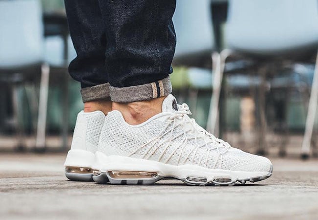 The Nike Air Max 95 Ultra Jacquard ‘Sail’ and ‘Black’ is now starting to release at Nike Sportswear retailers overseas with Titolo being one of the first locations to have them. Retail price is CHF 229.90 each which comes out to be about $235 USD. A full size run is available in each color and expect stateside retailers to have these two pairs very soon. For now you can check out on foot photos by scrolling below.