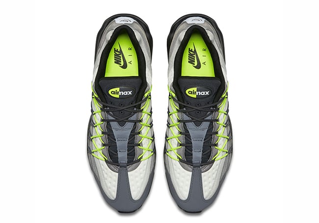 Looking closer, you will notice that Nike used a seamless mesh upper on this Nike Air Max 95 along with mesh and foam. In addition and probably what stands out the most is the use of Flywire cables through the panels. Other then that, they use shades of Grey through the base, hits of Neon and Volt.