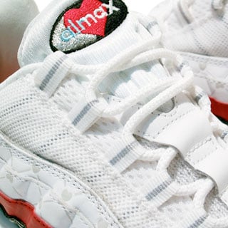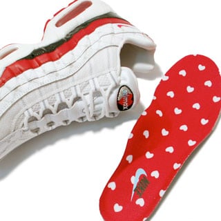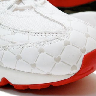 The Nike Air Max 95 Valentines Day 2008 features a dominate White Upper, with Red and Black accents. Also around the toe box running to the heel is embossed hearts, giving this Air Max 95 a true loving feel. Available now at Atmos.
