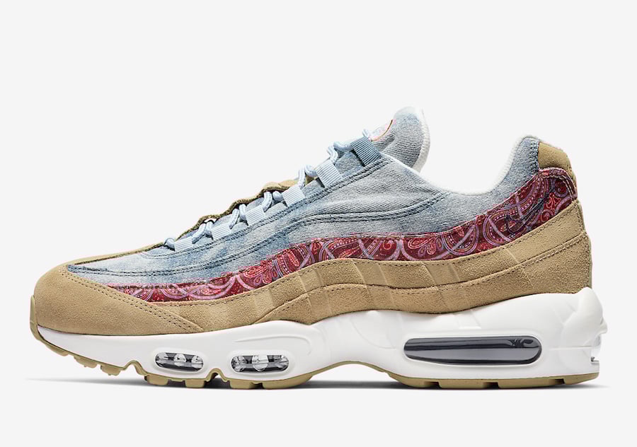 This Nike Air Max 95 comes dressed in a Parachute Beige, University Red, Thunderstorm, Light Armory Blue, Sail and Armory Navy color combination. Looking closer it features a bit of denim, suede and paisley which gives them the Wild West vibes.