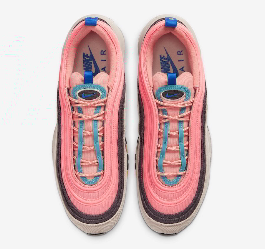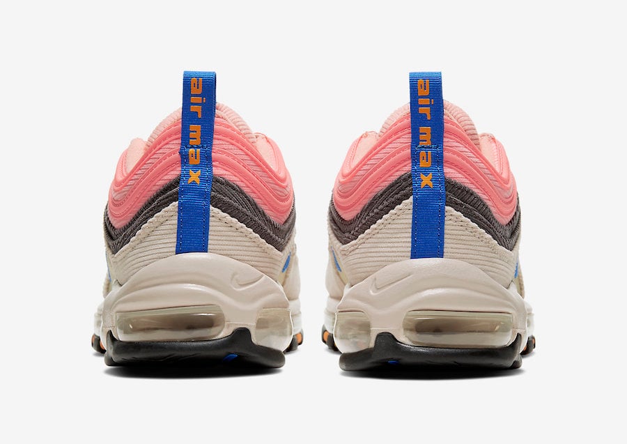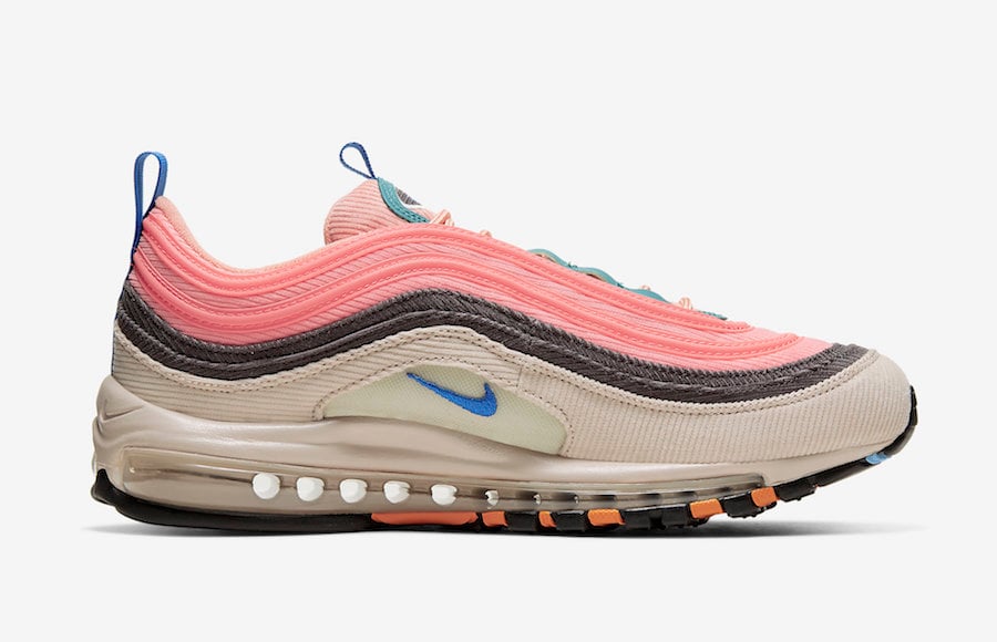The two Nike Air Max 97 releases utilize a mixture of Blue, Charcoal, Pink, Beige and Orange shades throughout. 3M Reflective accents lands on the tongue while corduroy material runs across the entire upper. Other details includes stitched Swoosh logos on the sides and a mostly Black rubber outsole.