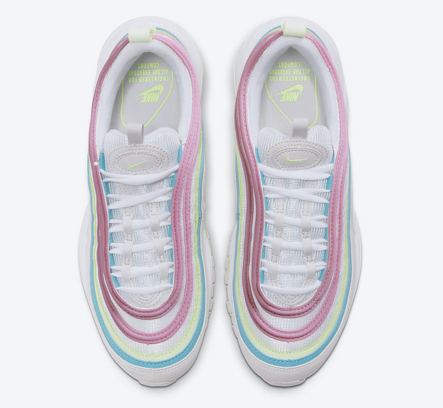 Releasing in womenโs sizing, this Nike Air Max 97 comes dressed in a White, Barely Volt and Platinum Tint color combination. Using White mesh across the base while shades of Volt, Blue and Pink is spread throughout which gives them a Spring time feel. In addition we have Barely Volt placed within the Air Max unit while a White midsole and matching rubber outsole finishes the look.