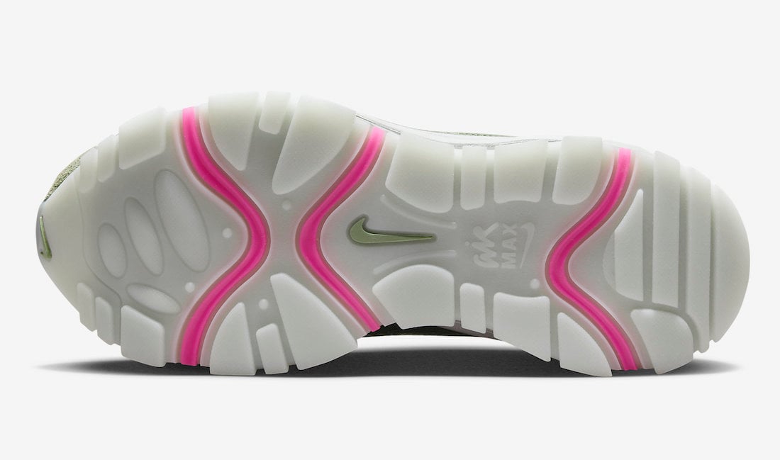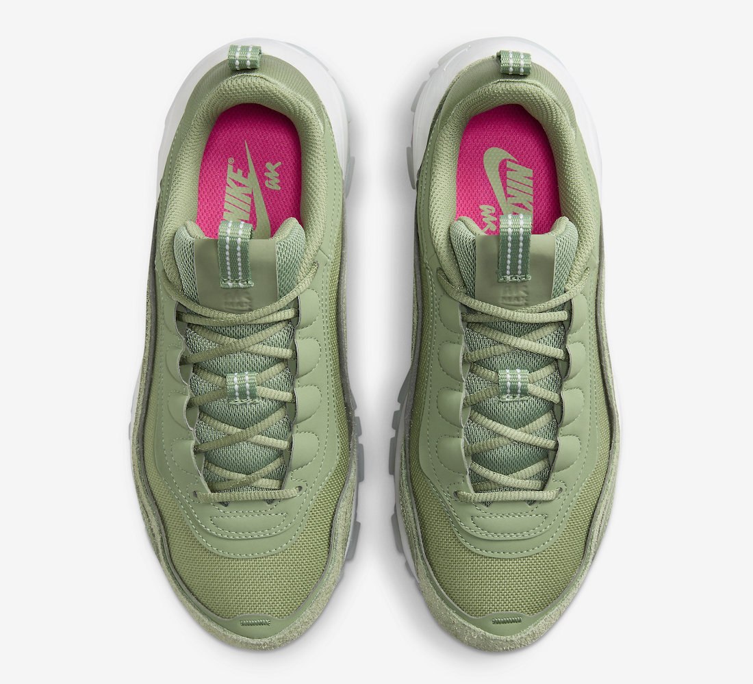 This Nike Air Max 97 Futura comes with a layered build while constructed with mesh, suede, and leather. Highlighted with Olive Green across the base with a mini embroidered Swoosh on the sides. Next, we have a White thick midsole, Pink insoles, and a semi-translucent outsole. The signature wavy overlays on the side have been updated for a new look. Overall, the design is beefed up with layered mudguards, dual pull tabs, an eyestay guard, and a full-length Air Max unit.