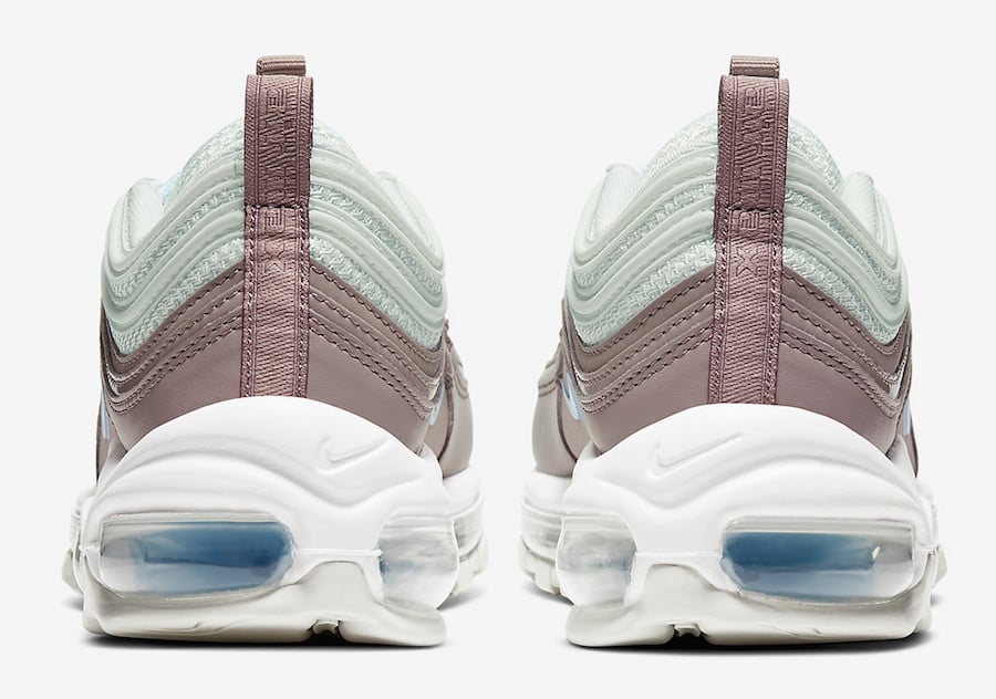 This Nike Air Max 97 comes dressed in a Spruce Aura, Celestine Blue and Pumice White color combination. Utilizing White mesh across the upper while leather covers the overlays. In addition Light Blue detailing lands on the tongue, Swoosh logos, placed within the Air Max unit and laces. White then covers the midsole while Off-White is applied to the rubber outsole to finish the look.