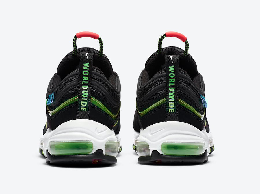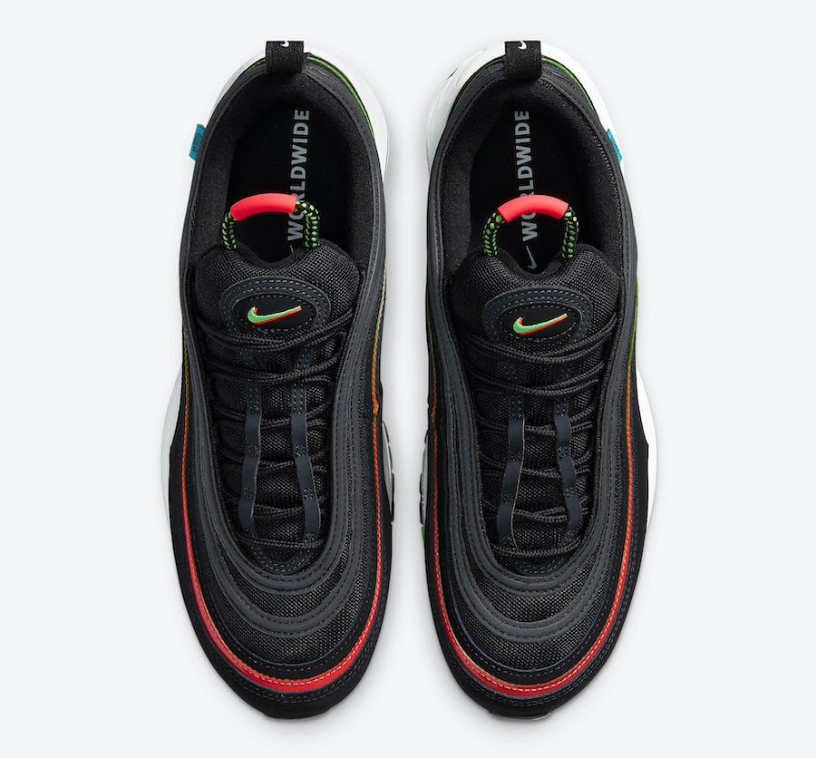 Looking closer this Nike Air Max 97 comes with Black across the upper while both Crimson and Green Strike accents are spread throughout. In addition Blue Fury lands on the tag which is located on the lateral side. Following we have โWorldwideโ text in Green on the heel and in White on the insoles. Other details includes White on the midsole and mostly Black on the rubber outsole.