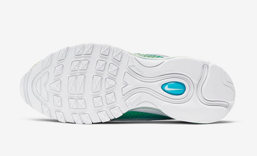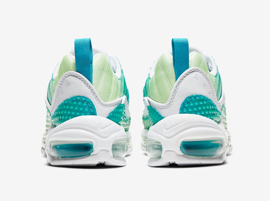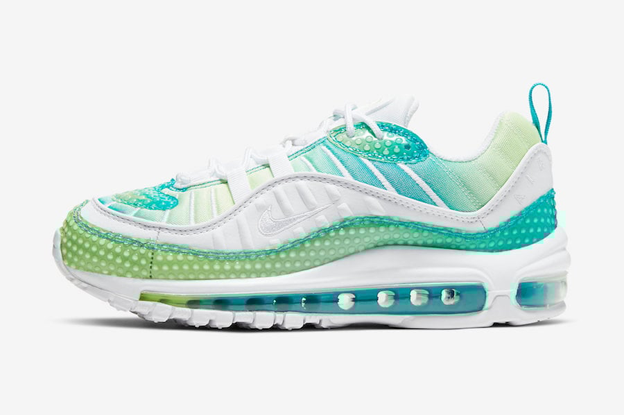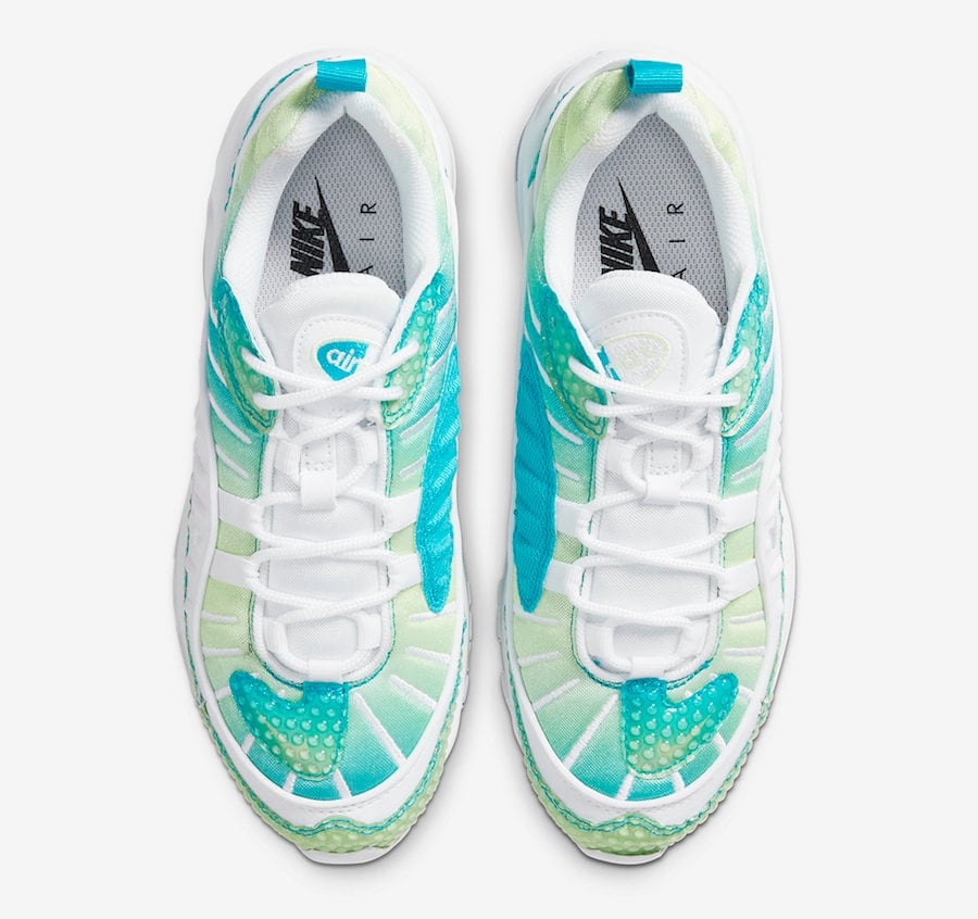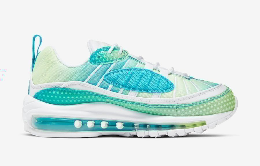 Featuring an Oracle Aqua, White and Barely Volt color combination. This Nike Air Max 98 utilizes Aqua to Volt gradient mesh while White lands on the tongue, laces, liner and panels. Bubble wrap also covers the mudguard, upper eyelets and forefoot while a gradient Air Max unit and a White rubber outsole finishes the look.