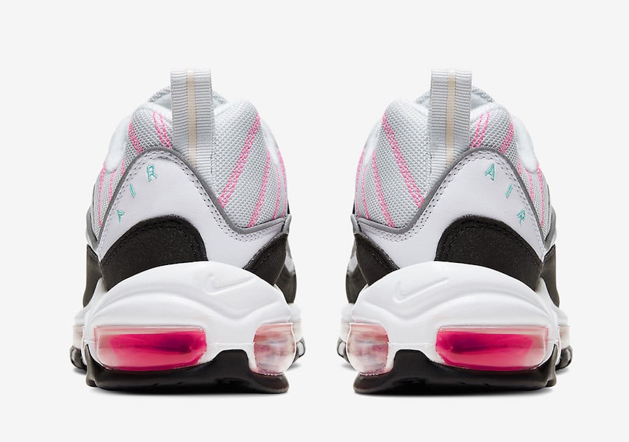 Looking closer this Nike Air Max 98 features Platinum mesh across the upper while White and Black leather lands on the overlays, toe and heel. Finishing the look and giving this pair the Miami South Beach look is both Pink and Teal accents.