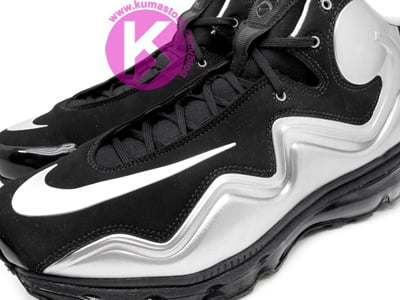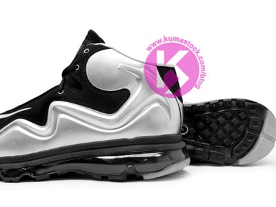 Based on the Flyposite football cleat, the kicks are seen here with a silver Foamposite shell and black nubuck upper alongside a black tongue, white Swoosh, Flyposite and football tongue branding and a black 360 Max Air unit with a black rubber outsole.