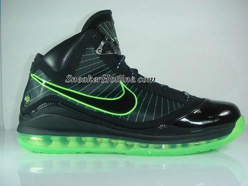 When we first reported on the Nike Air Max Lebron VII “Dunkman,” SEVERAL automatically deemed it the best colorway yet. Capable of drawing comparisons to such classics as the Air Jordan XIII “Altitude” a.k.a. “Hulks,” this Lebron VII comes in a predominantly black upper with a patent leather mudguard and neon green accents on places like the sole unit and Nike swoosh outline. Now, a couple of more pictures have hit the internet, allowing us a better look at the heel and front of the shoe. We also get a better look at the accompanying shoe laces, which are black with white dots. So enjoy the pictures while you continue praying for these to release.