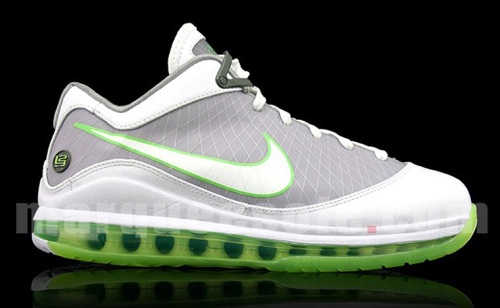 Recently we saw the white/silver Nike Lebron VII low go on sale, to the enjoyment of several sneakerheads wondering if/when these low-top designs would be making a general release. Now we’d like to show you the newest low-top Lebron VII to surface. Pictured here is the “mean green” Nike Air Max Lebron VII low. Unlike most of the Nike Lebron VII lows we’ve seen thus far, this pair actually DOES include the 360-degree Air Max sole missing from previous ones. While the upper comes in a mix of white and grey, there are “mean green” accents on places like around the Nike swoosh and the entire sole. However, release information for these bad boys is yet to surface. So, for now, you can enjoy the following pictures before we bring you any developing news regarding an official drop.