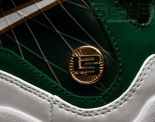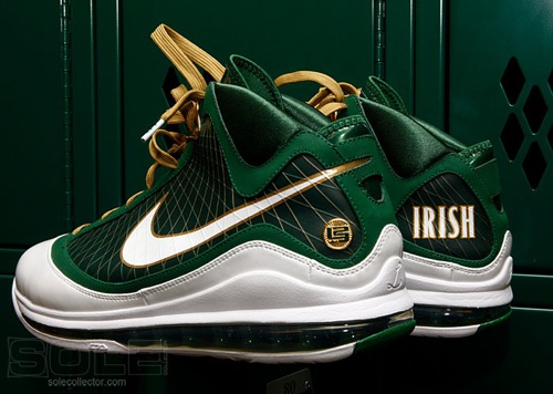 Over the past years we’ve seen a plethora of Nike Lebron silhouettes that have gotten special treatment with a Saint Vincent-Saint Mary color palette. But this colorway hasn’t been limited to only Lebron signature series shoes, as we saw the Air Force 25 get the special treatment last year. Now, we’d like to show you how those colors have been executed on the latest installment of the Nike Lebron signature series. Pictured here is the Saint Vincent-Saint Mary Nike Air Max Lebron VII PE with a predominantly green and white pattern along the upper. Gold accents can be seen by way of the Nike swoosh outline, LBJ medallion, and shoe laces.