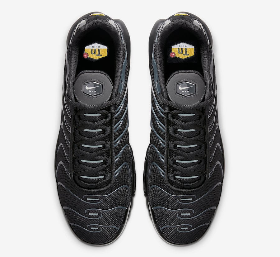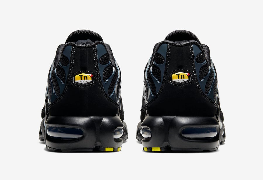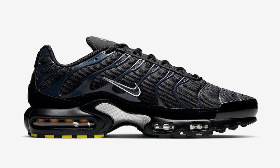 Looking closer this Nike Air Max Plus comes with Black mesh across the upper while Navy Blue is applied to the plastic overlays. Following we have Silver outlined on the Swoosh and placed on the mid-foot shank plate. Black runs across the midsole while Yellow is seen within the Air Max unit and pods on the outsole. Finishing the look is Reflective accents.