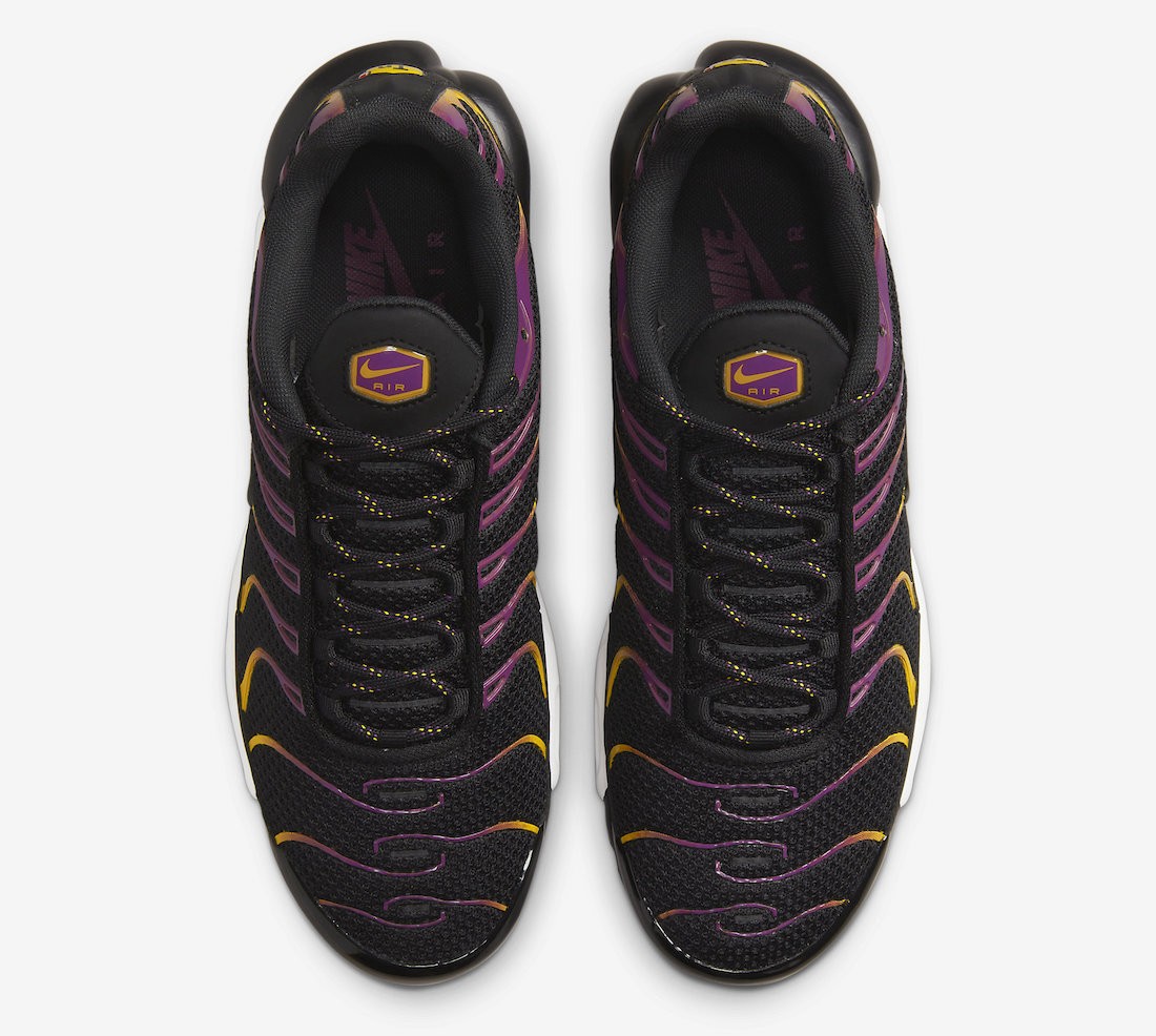 This flashy Nike Air Max Plus features Black on the base while the cage overlay comes with a Purple to Gold gradient, giving the pair ACG vibes. Constructed with mesh and leather, speckled detailing hits the laces while White drapes the midsole. Lastly, a Black rubber outsole completes the look.