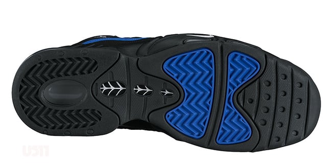 Featuring a black leather upper that is complimented with royal blue accents across the side that extends around the heel, tongue branding and hints on the sole. A bit of white can be seen throughout the shoes branding.