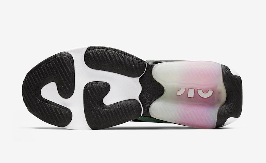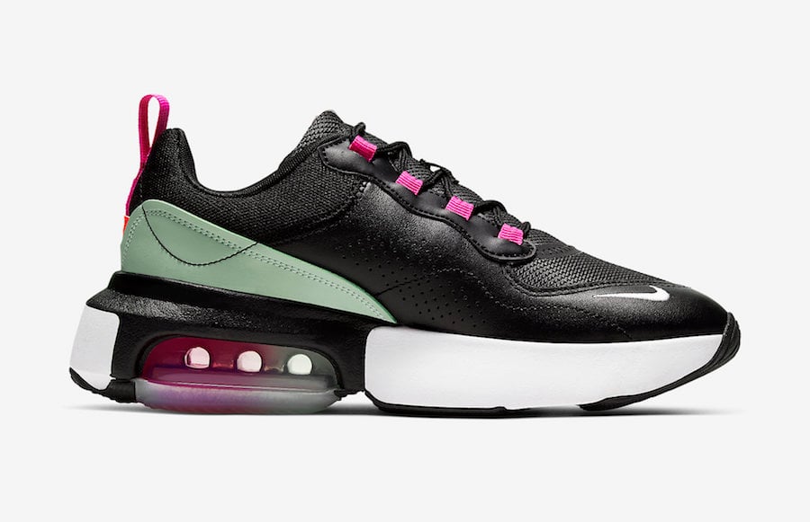Dressed in a Black, Summit White and Fire Pink color combination. Black mesh and leather lands on the upper while White is applied to the Swoosh across the panels. A pastel shade of Green lands on the leather overlays by the heel and Pink hits the lace loops, heel tab, insoles and Air unit. Completing the look is Orange on the tongue and heel.