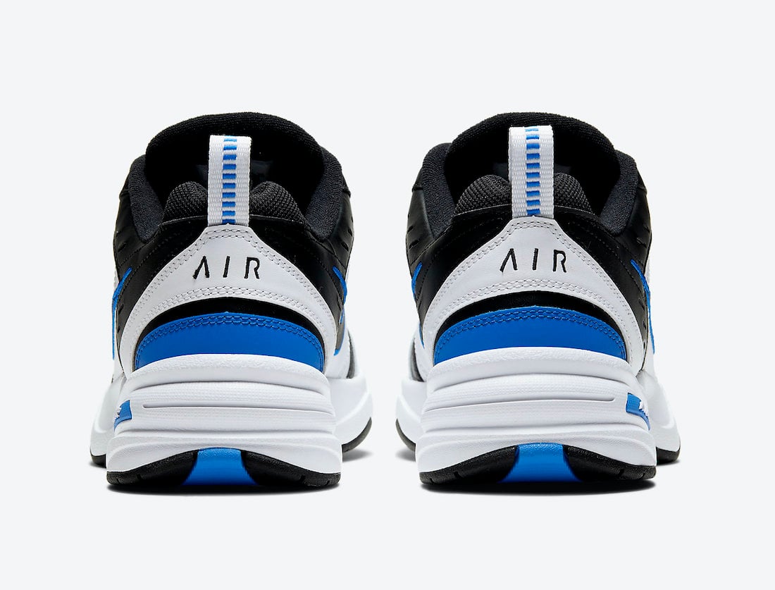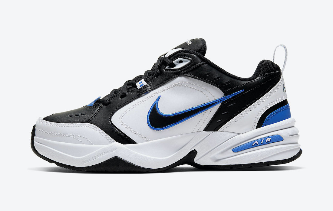 Looking closer, this Nike Air Monarch 4 comes dressed in a Black, White, and Royal color combination. First, we have Black and White durable leather across the upper along with exposed stitching. Following, Royal Blue appears on the heel pull tab, outlining the Swoosh, tongue overlay, and other small accents throughout. Finally, a White midsole and all three colors adorn the outsole to finish the look.