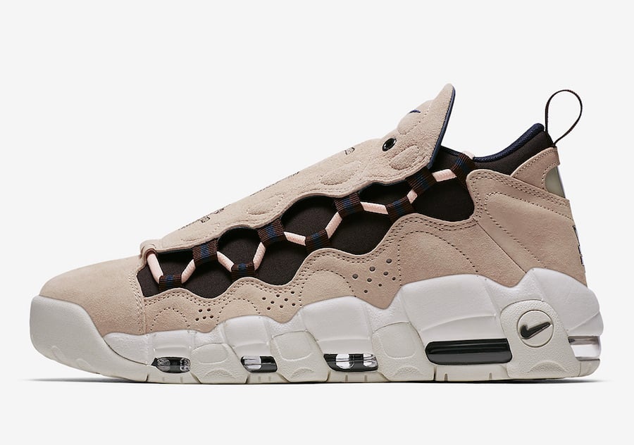 This Nike Air More Money features the Japanese Flag on the heel along with the Yen sign. In addition we have custom embroidery on the removable shroud. As you can see they are dressed in predominate Beige while accents of Navy is used. Completing the look is White on the outsole.