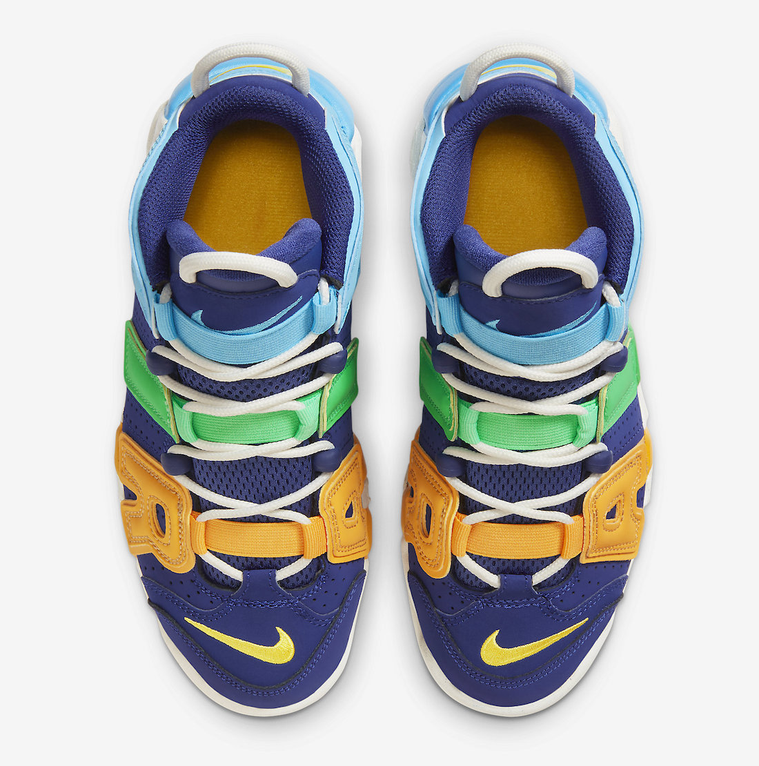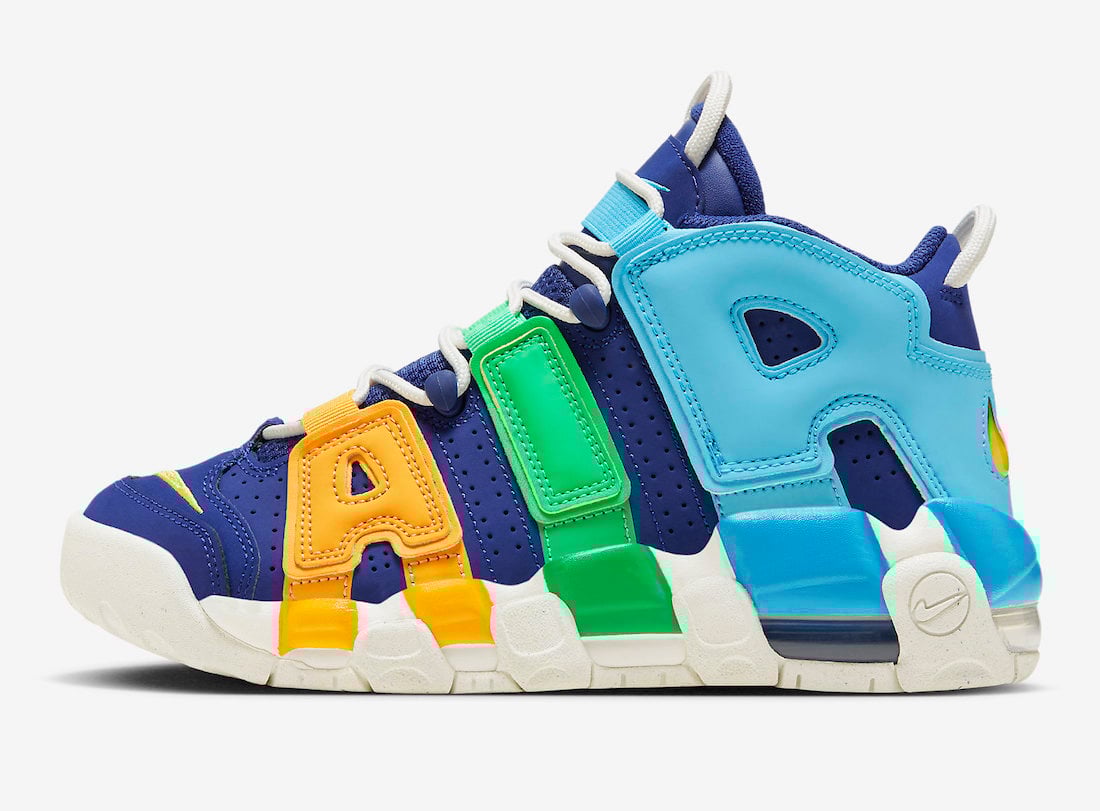 Highlighted in a Deep Royal Blue, Baltic Blue, Electric Algae, and Opti Yellow color combination. This Nike Air More Uptempo comes constructed with leather, nubuck, and mesh with perforations on the panels. The large โAIRโ branding on the sides features Yellow, Green, and Blue, which gives the pair a playful look.