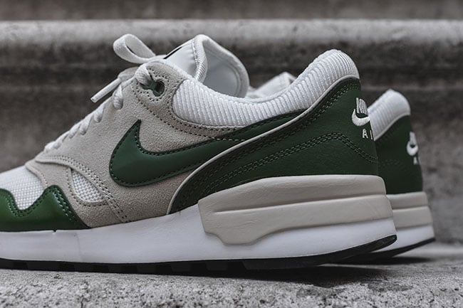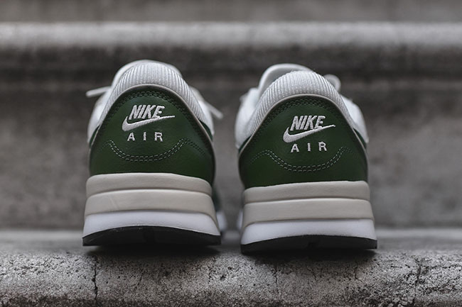 Forest green leather finds it’s way onto the Swoosh, around the toe box and heel while grey suede lands on the panels. A bit more grey overlaps the midsole by the heel while white lands on the midsole and mesh located on the toe box, tongue and collar.
