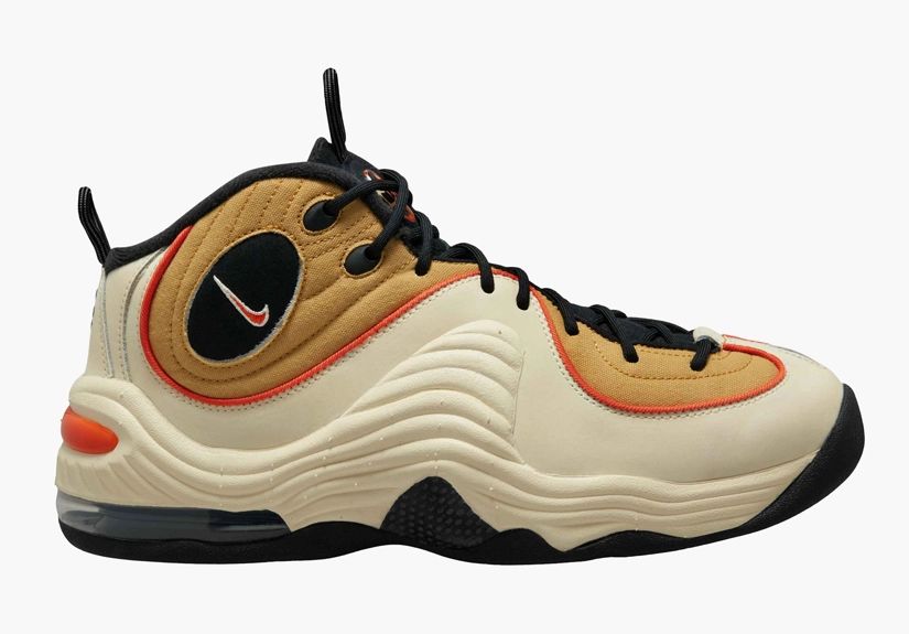 This Nike Air Penny 2 features a Wheat Gold, Safety Orange, Black, Coconut Milk, and White color combination. Constructed with canvas, leather, and suede, Coconut Milk appears on the panels, across the toe, and heel. Next, we have Wheat Gold on the toe and collar with the signature Penny logos. Finishing the look is Orange accents and a Black rubber outsole.