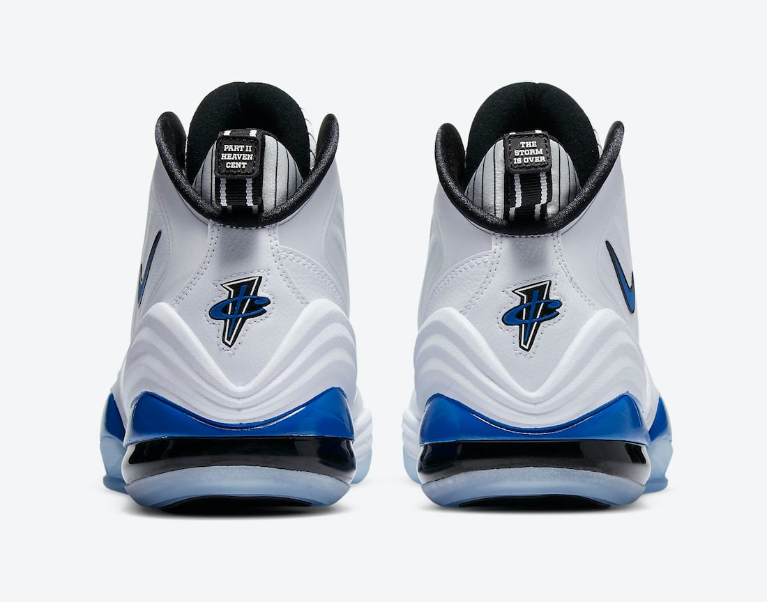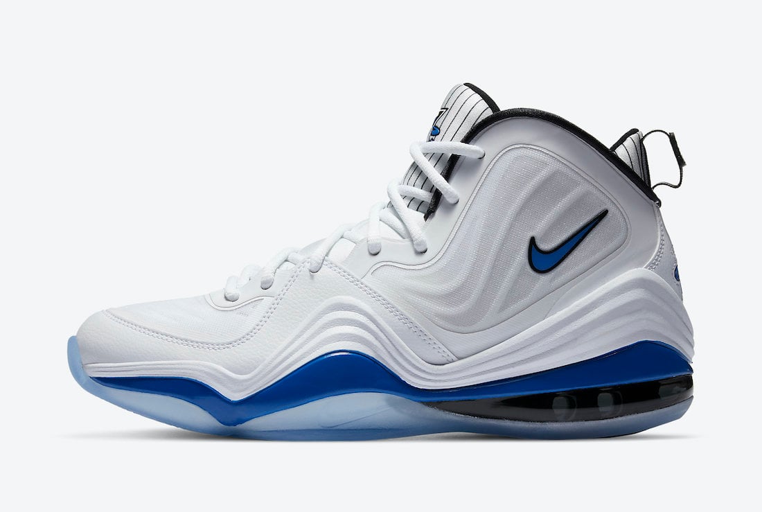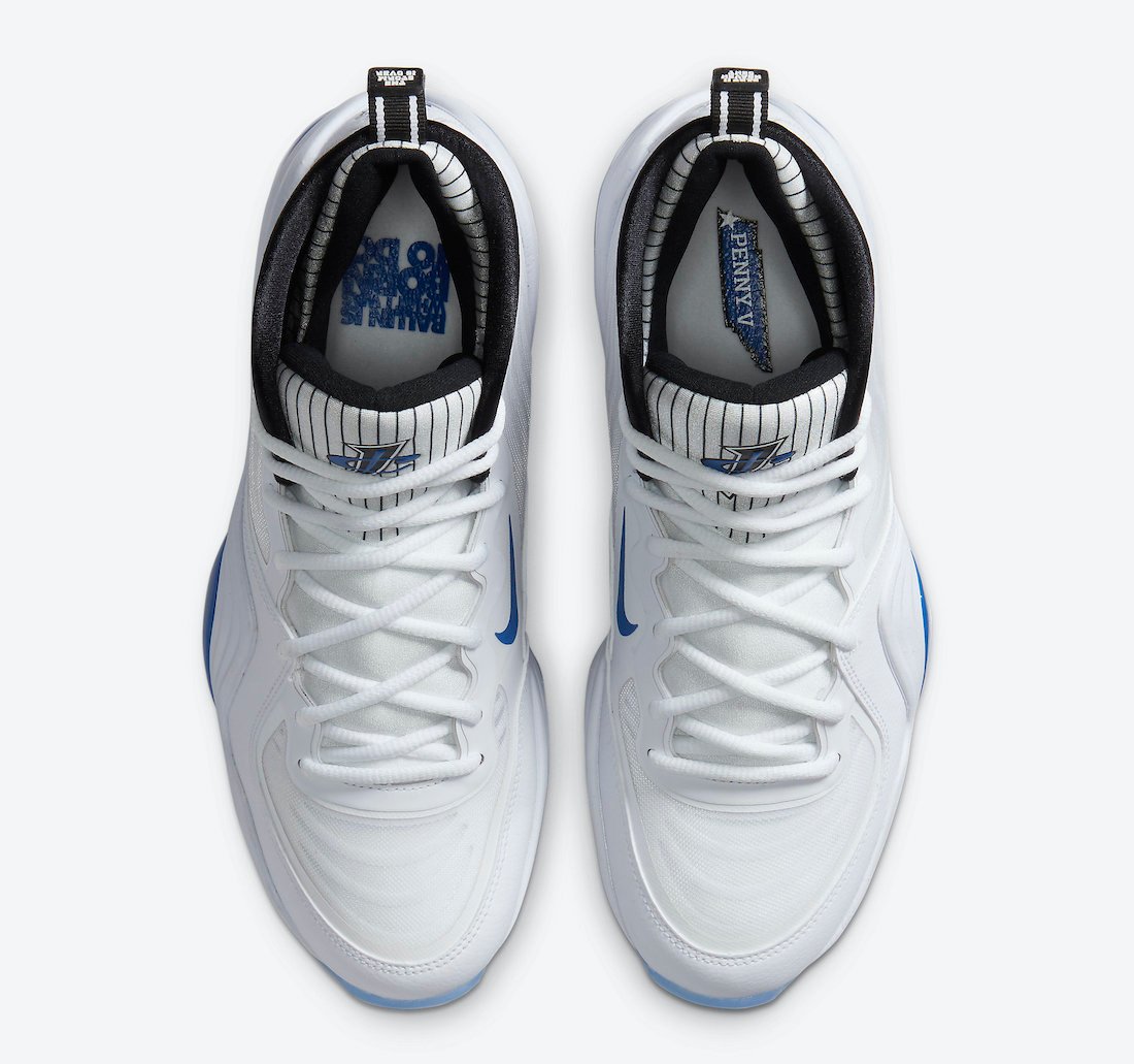 Looking closer this Nike Air Penny 5 utilizes a โHome Orlando Magicโ theme while utilizing White on the base, pinstripes on the tongue and heel. In addition we have Royal Blue on the Swoosh, Penny branding and part of the midsole. Completing the look is a translucent outsole.