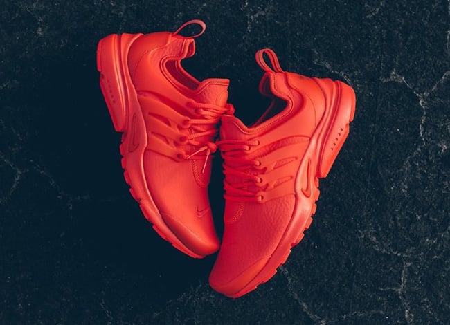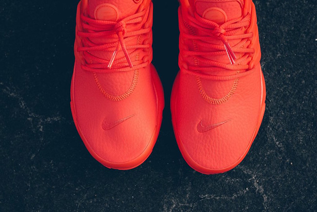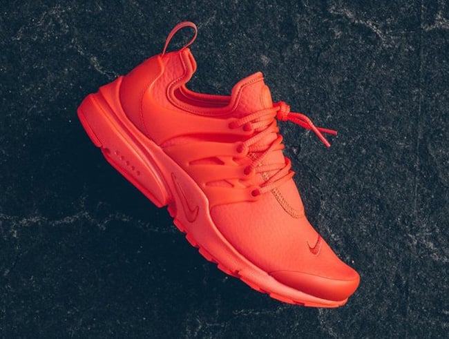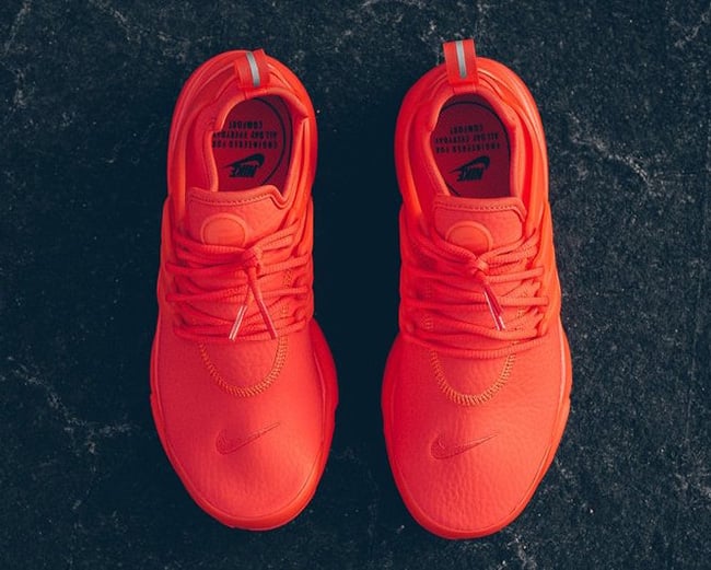 This Premium edition of the Nike Air Presto will feature leather across the uppers while Max Orange almost takes over the entire shoes. As you can see, the shade lands on the midsole, TPU cage and tongue, however a bit of Black is seen on the insole branding.