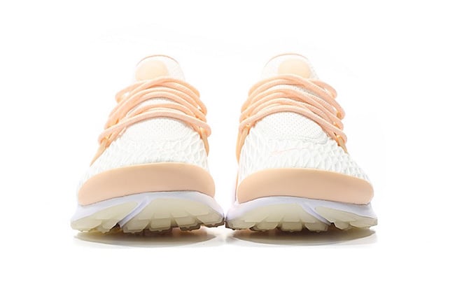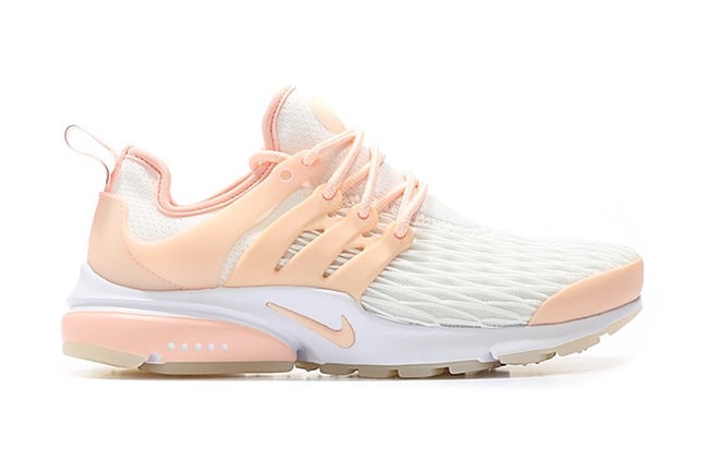 This Nike Air Presto comes in a White and Sunset Tint color combination. As you can see they are a bit different from previous releases while using a diamond cut mesh overlay on the toe which extends across the base. Sunset Tint which is a shade of Pink lands on the TPU overlays, toe cap, part of the midsole and branding. Other details include White accent while Gum covers the outsole.