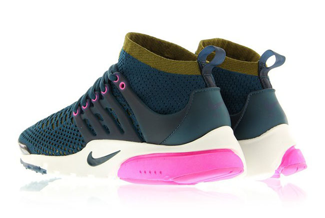 The Ultra Flyknit edition of the Nike Air Presto features a Midnight Turquoise, Olive Flak and Pink Blast color combination. As you can see, Midnight Turquoise covers the Flyknit base while Olive wraps the collar. In addition, we have Pink that hits part of the Off-White midsole and eyelets on the Black TPU cage.