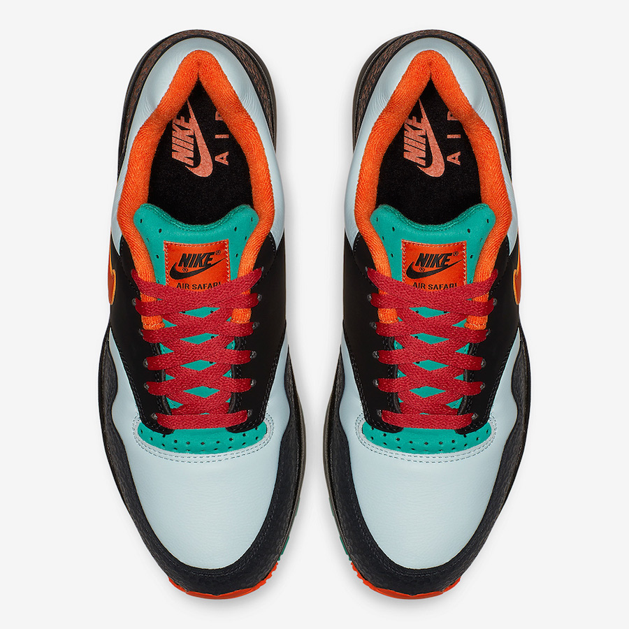This Nike Air Safari comes dressed in a bright shades throughout while Safari print lands on the overlays. Using Black, Teal, Orange, Red and Light Blue, which comes dressed like the Nike Air Max 1 Supreme from the โTech Packโ.