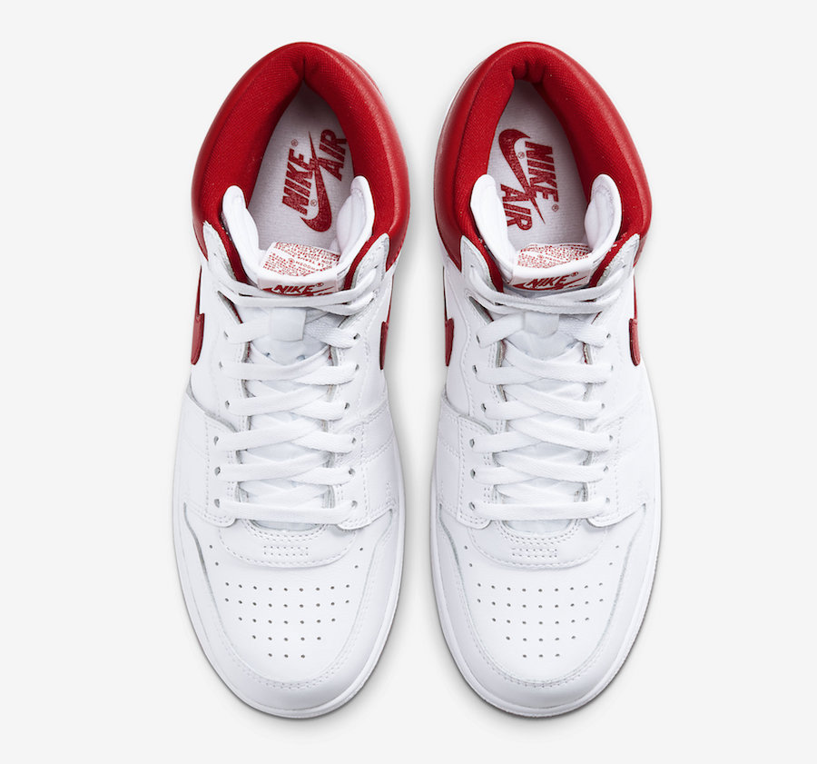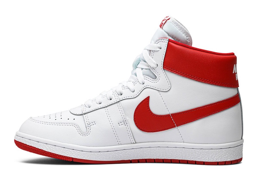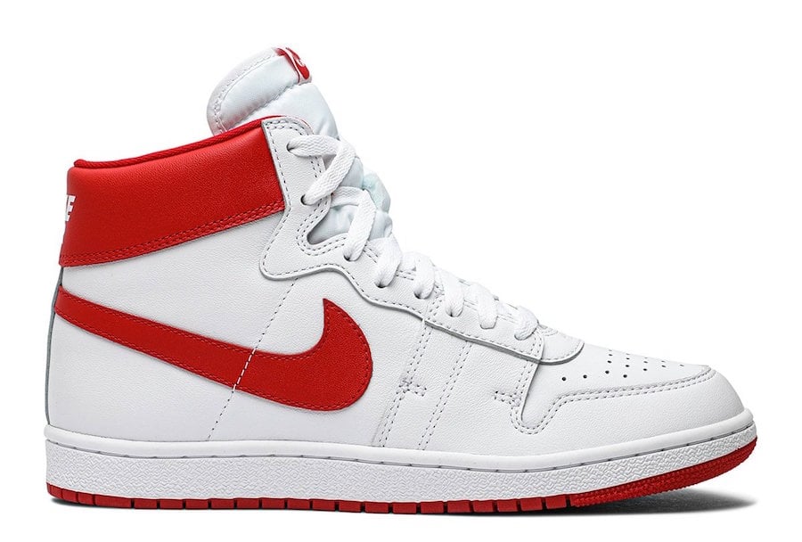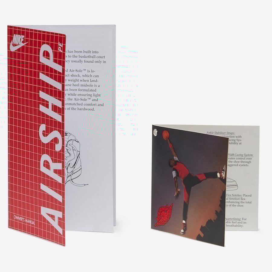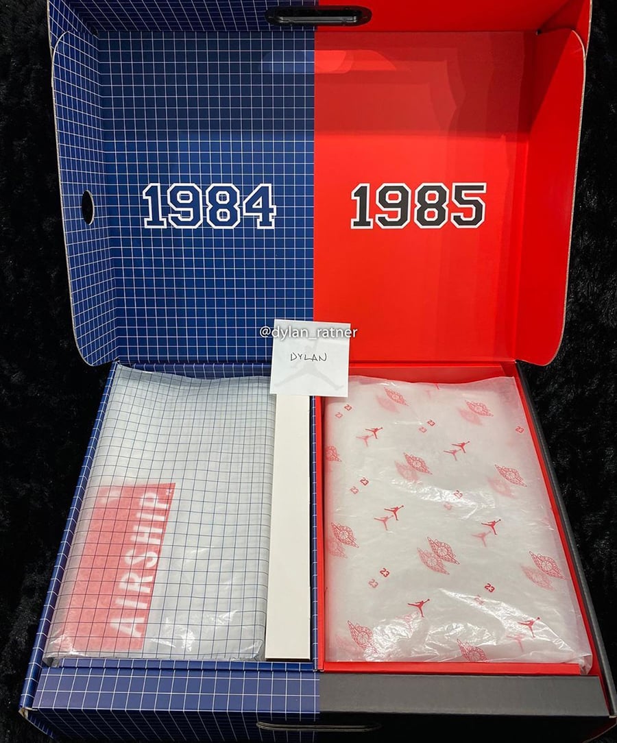Looking closer the Nike Air Ship comes with White leather across the upper while Red lands on the collar, Swoosh, liner and rubber outsole. The Air Jordan 1 will come in Red and White which is said to resemble an early sample colorway. It also comes with the OG hangtag. The two come in a split box done in Blue and White with a grid pattern while the other side is in Black and Red.